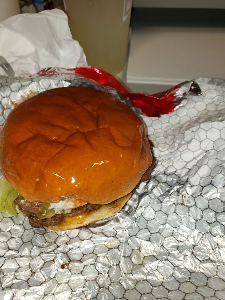 Three quarters of a pound of fresh beef, American cheese, crisp lettuce, tomato, pickle, ketchup, mayo, and onion on a toasted bun. Use both hands!